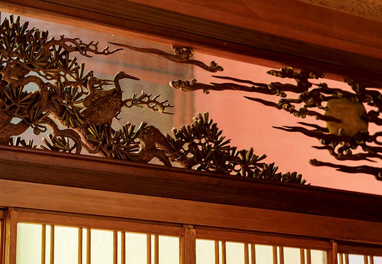 ご婚礼や各種会合、様々な催し物にご使用いただける丹頂の間の舞台。その背景を彩るのは、加賀友禅の巨匠 談議所栄二による不二庵の赤松を描いた染色作品です。櫻獅子同様、昭和33年本館改装時の作であり、金城樓が貫いてきた「文化の担い手」としての姿勢を表しています。